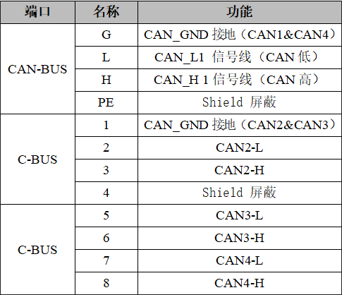GCAN-GT-414模塊CAN-bus接口由3個(gè)4 Pin接線端子引出,可以用于連接4個(gè)CAN-bus網(wǎng)絡(luò)或者CAN-bus接口的設(shè)備,其接口定義如下表所示。