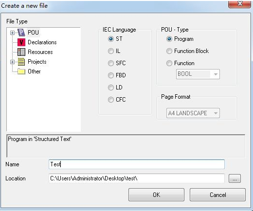 為項(xiàng)目添加文件(例如:添加ST語(yǔ)言編寫的程序頁(yè)ST,Program),如圖所示。請(qǐng)注意,Name(名稱)一欄中填入的字符串不能以數(shù)字為開頭。