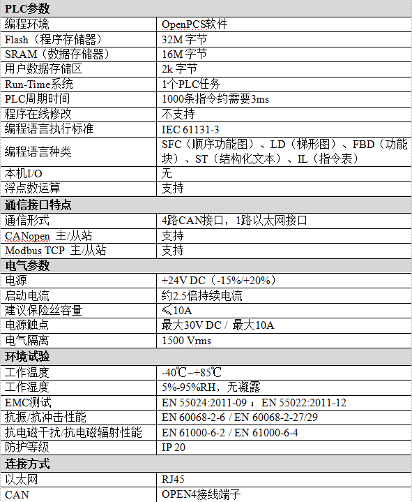 (1)高速的32位工業(yè)級(jí)處理器;(2)內(nèi)嵌硬件看門狗定時(shí)器;(3)使用外接電源供電(DC+24V,100mA);(4)靜電放電抗擾度等級(jí):接觸放電±2KV,空氣放電±8KV;(5)電快速瞬變脈沖群抗擾度等級(jí):±1KV;(6)浪涌抗擾度等級(jí):±1KV;(7)工作濕度范圍:5%~95%RH無凝露;(8)4路CAN總線接口,1路以太網(wǎng)接口;(9)編程軟件:OpenPCS(符合IEC 61131-3標(biāo)準(zhǔn));(10)支持CANopen協(xié)議主/從站功能;(11)支持Modbus TCP主/從站功能;(12)標(biāo)準(zhǔn)DIN導(dǎo)軌安裝方式,專為工業(yè)設(shè)計(jì)。(13)電氣隔離為1500 Vrms;(14)工作溫度范圍:-40℃~+85℃;(15)防護(hù)等級(jí):IP20。- GCAN-PLC產(chǎn)品功能及應(yīng)用視頻: