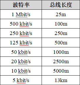 請注意:CAN-bus電纜可以使用普通雙絞線、屏蔽雙絞線。理論最大通信距離主要取決于總線波特率,最大總線長度和波特率關(guān)系詳見下表。若通訊距離超過1km,應(yīng)保證線的截面積大于Φ1.0mm2,具體規(guī)格應(yīng)根據(jù)距離而定,常規(guī)是隨距離的加長而適當(dāng)加大。