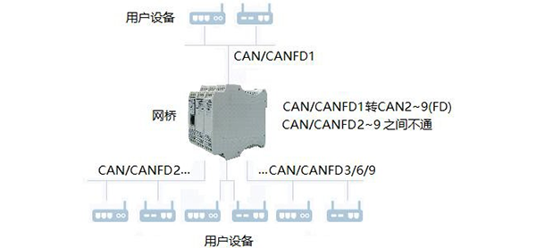 ● 網(wǎng)橋系列GCAN-GT-418產(chǎn)品,具有3/6/9個電氣隔離的CAN/CANFD總線接口,1路以太網(wǎng)接口。CAN/CANFD1作為主節(jié)點(diǎn),CAN/CANFD 2~3/2~6/2~9作為從節(jié)點(diǎn),每個從節(jié)點(diǎn)最多可以帶32個CAN設(shè)備。主節(jié)點(diǎn)和從節(jié)點(diǎn)的波特率可以自由配置,實(shí)現(xiàn)CAN/CANFD網(wǎng)絡(luò)的網(wǎng)橋功能,可以將不同速率的CAN/CANFD網(wǎng)絡(luò)數(shù)據(jù)轉(zhuǎn)發(fā)到CAN/CANFD1通道;