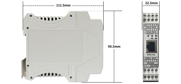 GCAN-GT-418-3/3R/3C的設(shè)備外形尺寸:(長,含接線端子)111.5mm*(寬)22.5mm*(高)99.5mm,其示意圖如圖所示。注:GCAN-GT-418-6/6R/6C設(shè)備寬45mm,GCAN-GT-418-9/9R/9C設(shè)備寬67.5mm。長和高與GCAN-GT-418-3/3R/3C型號一致。