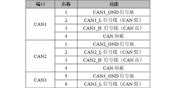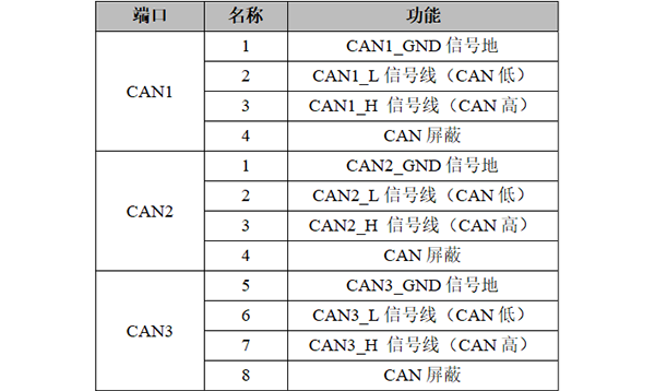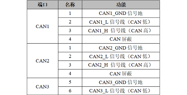 GCAN-GT-418-3系列模塊CAN/CANFD接口由3個4Pin接線端子引出,有3個獨(dú)立的CAN/CANFD接口,其接口定義如下表所示。