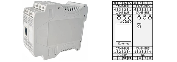 (1)GCAN-GT-418-6/6R/6C系列接口定義GCAN-GT-418-6系列模塊硬件一致:集成1路DC24V電源接口、6路標(biāo)準(zhǔn)CAN/CANFD接口、1路標(biāo)準(zhǔn)太網(wǎng)接口,GCAN-GT-418-6系列模塊接線端子排如下圖所示。
