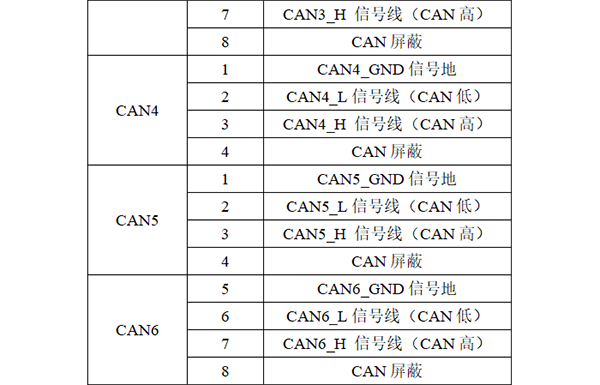 GCAN-GT-418-6系列模塊CAN/CANFD接口由6個4Pin接線端子引出,有6個獨(dú)立的CAN/CANFD接口,其接口定義如下表所示。
