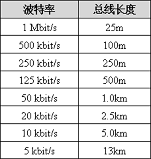 波特率與最大總線長度參照表