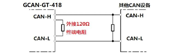 請注意:GCAN-GT-418系列模塊的CAN總線內(nèi)部未集成120Ω終端電阻。如果節(jié)點(diǎn)數(shù)目大于2,中間節(jié)點(diǎn)不需要安裝120Ω的終端電阻。需要使用時,將電阻兩端分別接入CAN_H、CAN_L即可,如下圖所示。