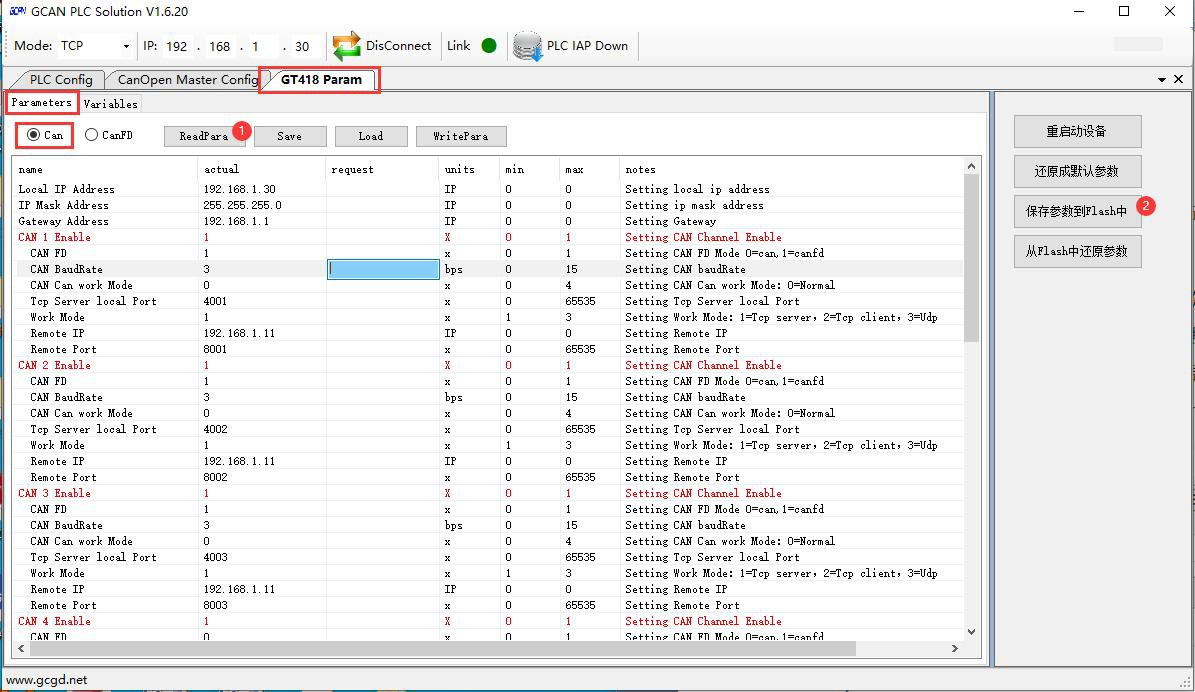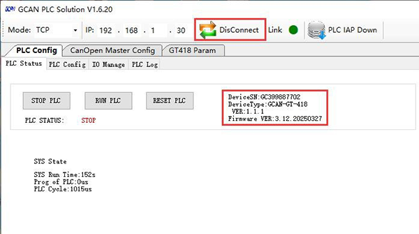 (1)打開GCAN_PLC_Solution軟件,Mode選擇TCP模式,418的網(wǎng)口連接上位機(jī),輸入418的IP地址(出廠默認(rèn)192.168.1.30),點(diǎn)擊“Connect”按鈕。連接成功后會顯示418的相關(guān)參數(shù)信息。