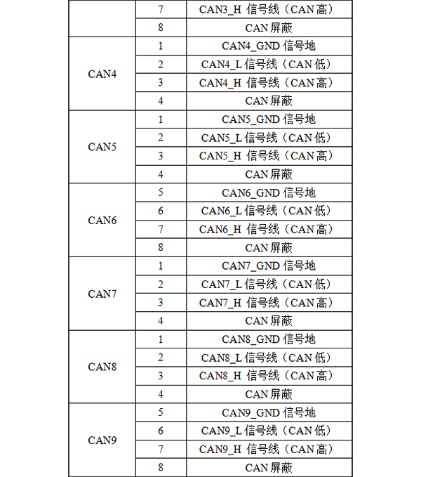 GCAN-GT-418-9系列模塊CAN/CANFD接口由9個4Pin接線端子引出,有9個獨(dú)立的CAN/CANFD接口,其接口定義如下表所示。
