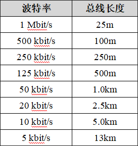 請(qǐng)注意:CAN-bus電纜可以使用普通雙絞線、屏蔽雙絞線。理論最大通信距離主要取決于總線波特率,最大總線長(zhǎng)度和波特率關(guān)系詳見(jiàn)下表。若通訊距離超過(guò)1km,應(yīng)保證線的截面積大于Φ1.0mm2,具體規(guī)格應(yīng)根據(jù)距離而定,常規(guī)是隨距離的加長(zhǎng)而適當(dāng)加大。