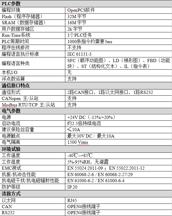 (1)高速的32位工業(yè)級(jí)處理器;(2)內(nèi)嵌硬件看門狗定時(shí)器;(3)使用外接電源供電(DC+24V,100mA);(4)靜電放電抗擾度等級(jí):接觸放電±2KV,空氣放電±8KV;(5)電快速瞬變脈沖群抗擾度等級(jí):±1KV;(6)浪涌抗擾度等級(jí):±1KV;(7)工作濕度范圍:5%~95%RH無(wú)凝露;(8)2路CAN總線接口,1路以太網(wǎng)接口,1路RS232串行接口;(9)編程軟件:OpenPCS(符合IEC 61131-3標(biāo)準(zhǔn));(10)支持CANopen協(xié)議主/從站功能;(11)支持Modbus RTU/TCP主/從站功能;(12)標(biāo)準(zhǔn)DIN導(dǎo)軌安裝方式,專為工業(yè)設(shè)計(jì)。(13)電氣隔離為1500 Vrms;(14)工作溫度范圍:-40℃~+85℃;(15)防護(hù)等級(jí):IP20;- GCAN-PLC產(chǎn)品功能及應(yīng)用視頻: