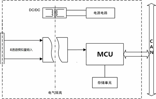 GCAN-4038模塊包含8路模擬量隔離輸入、電源電路、MCU最小系統(tǒng)、CAN通信電路等幾部分,模塊原理框圖如圖所示。