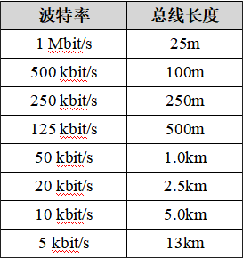 請(qǐng)注意:CAN-bus電纜可以使用普通雙絞線、屏蔽雙絞線。理論最大通信距離主要取決于總線波特率,最大總線長(zhǎng)度和波特率關(guān)系詳見下表。若通訊距離超過1km,應(yīng)保證線的截面積大于Φ1.0mm2,具體規(guī)格應(yīng)根據(jù)距離而定,常規(guī)是隨距離的加長(zhǎng)而適當(dāng)加大。