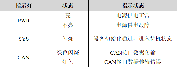 GCAN-4038模塊具有1個(gè)PWR指示燈、1個(gè)SYS指示燈、1個(gè)CAN指示燈來指示設(shè)備的運(yùn)行狀態(tài)。這3個(gè)指示燈的具體指示功能及狀態(tài)如下表所示。