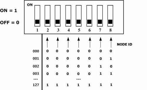 如圖下圖所示,撥碼開關(guān)的每個(gè)位撥向“ON“位置時(shí),該位為“1”,如果撥向“OFF”位置,則該位為“0”。撥碼開關(guān)的2-8位用于設(shè)定模塊的節(jié)點(diǎn)號(hào)(NODE ID),第八位為最低位,第二位為最高位,模塊的節(jié)點(diǎn)號(hào)(NODE ID)是各位對(duì)應(yīng)的十進(jìn)制值之和,通過撥碼開關(guān)設(shè)定模塊的節(jié)點(diǎn)號(hào)(NODE ID)的有效范圍為0~127。