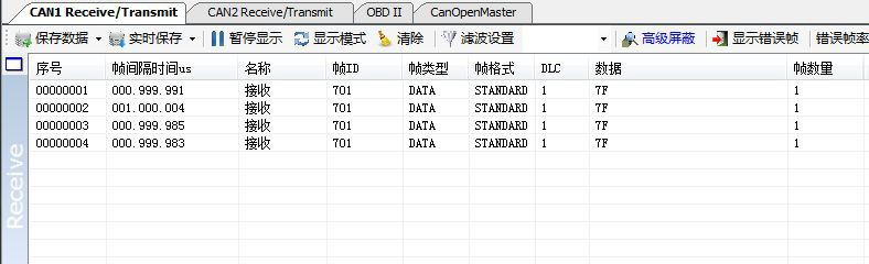 例如:通過撥碼開關(guān)設(shè)置GCAN-4038的Node ID為1(以下節(jié)點(diǎn)號(hào)均為1),則USBCAN-II Pro作為主站設(shè)備可接收到一條節(jié)點(diǎn)狀態(tài)數(shù)據(jù),幀ID為0x701,幀數(shù)據(jù)為0x7F。如圖5.1所示,使用ECANTools軟件可以收到這條數(shù)據(jù)。