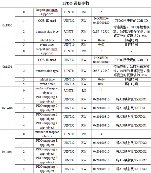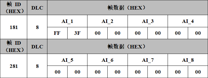 例如,GCAN-4038模塊節(jié)點(diǎn)號(hào)設(shè)為1。若目前端口形式為默認(rèn)的-10V~+10V,若通道1輸入的電壓為5V,則對(duì)應(yīng)數(shù)字量為16383,轉(zhuǎn)換為16進(jìn)制是3FFF,又因?yàn)閿?shù)據(jù)傳輸中低位在前高位在后,所以數(shù)據(jù)為FF 3F。若其余通道均無輸入,則TPDO1命令的幀ID為0x181,數(shù)據(jù)長(zhǎng)度(DLC)為8,幀數(shù)據(jù)為FF 3F 00 00 00 00 00 00。TPDO2命令的幀ID為0x281,數(shù)據(jù)長(zhǎng)度(DLC)為8,幀數(shù)據(jù)為00 00 00 00 00 00 00 00。
