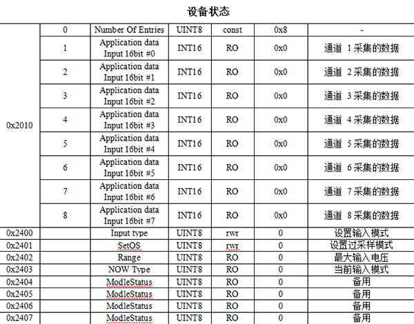 GCAN-4038模塊可通過發(fā)送SDO命令寫參數(shù),修改模擬量輸入形式。該參數(shù)位于對(duì)象字典索引0x2400、子索引0x00,數(shù)據(jù)類型Unsigned8。數(shù)據(jù)為0x02和0x07時(shí)為-10V~+10V,數(shù)據(jù)為0x00時(shí)為-5V~+5V,數(shù)據(jù)為0x05時(shí)為-20mA~+20mA。默認(rèn)為-10V~+10V。