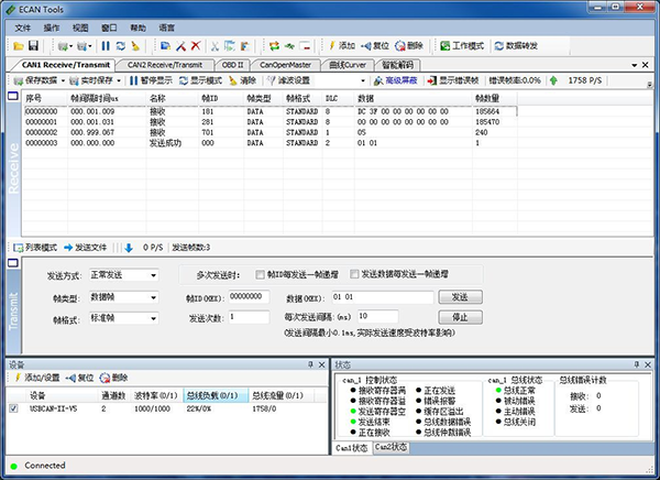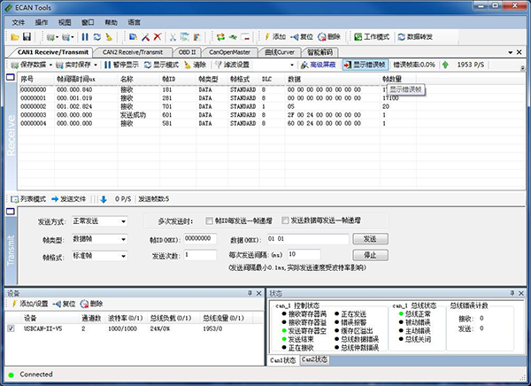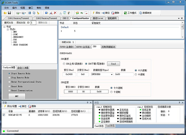 本章將使用廣成科技USBCAN-II Pro模塊及ECANTools軟件可以進(jìn)行CAN總線數(shù)據(jù)的接收與發(fā)送。軟件附帶的CANopen主站功能可以幫助調(diào)試CANopen從站,非常的方便實(shí)用。