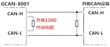 請注意:GCAN-IO-8001模塊內(nèi)部未集成120Ω終端電阻。如果節(jié)點數(shù)目大于2,中間節(jié)點不需要安裝120Ω的終端電阻。需要使用時,將電阻兩端分別接入CAN_H、CAN_L即可,如上圖所示。