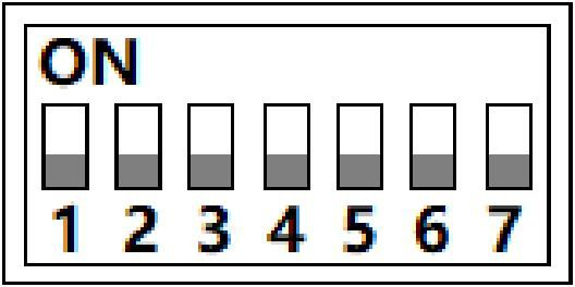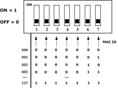 如圖所示,撥碼開關(guān)的每個位撥向“ON“位置時,該位為“1”,如果撥向“OFF”位置,則該位為“0”。撥碼開關(guān)的1-7位用于設(shè)定模塊的節(jié)點號(MAC ID),第7位為最低位,第1位為最高位,模塊的節(jié)點號(MAC ID)是各位對應(yīng)的十進(jìn)制值之和,通過撥碼開關(guān)設(shè)定模塊的節(jié)點號(MAC ID)的有效范圍為0~127。