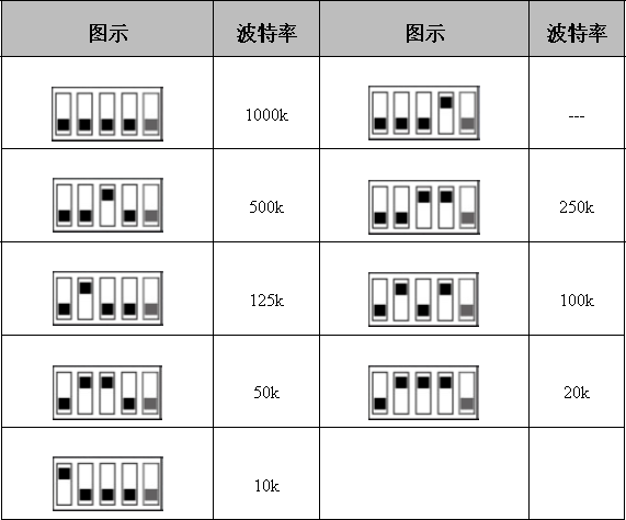 撥碼開關(guān)的1-4位用于設(shè)定模塊的波特率。波特率與開關(guān)設(shè)置對應(yīng)值如下表所示。