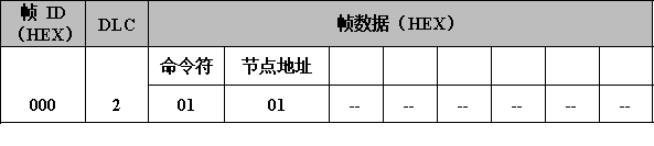 GCAN-IO-8001模塊接收由主站發(fā)出的操作指令,幀ID為0x000,DLC為2,幀數(shù)據(jù)第一個字節(jié)為命令符,第二個字節(jié)為節(jié)點號(00則為全部節(jié)點)。