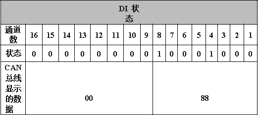 數(shù)字量輸入的狀態(tài)由二個字節(jié)來表示,通道16在高位,通道1在低位。例如,GCAN-IO-8001模塊節(jié)點號設(shè)為1。通道8和通道4狀態(tài)為1,其他狀態(tài)均為0,則CAN總線一端顯示的DI狀態(tài)數(shù)據(jù)為88。則發(fā)出的幀ID為0x181,數(shù)據(jù)長度(DLC)為8,幀數(shù)據(jù)為0x00,0x88,0x00,0x00,0x00,0x00,0x00,0x00。請注意,僅插入一個GC-1416模塊時,幀數(shù)據(jù)中只有第一個字節(jié)和第二個字節(jié)是有效的。下表列舉了兩種常見的DI狀態(tài)及其對應(yīng)的狀態(tài)數(shù)據(jù)。