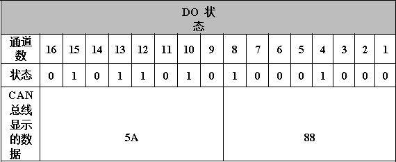例如,GCAN-IO-8001模塊節(jié)點號設(shè)為1。需設(shè)置通道8和通道4狀態(tài)為1,設(shè)置其他狀態(tài)均為0,則需要發(fā)送的CAN總線DO狀態(tài)數(shù)據(jù)為88。需要發(fā)送給GCAN-IO-8001的幀ID為0x201,數(shù)據(jù)長度(DLC)為8,幀數(shù)據(jù)為0x5A,0x88,0x00,0x00,0x00,0x00,0x00,0x00。請注意,幀數(shù)據(jù)中只有第一個字節(jié)和第二個字節(jié)是有效的。下表列舉了DO狀態(tài)及其對應(yīng)的狀態(tài)數(shù)據(jù)。