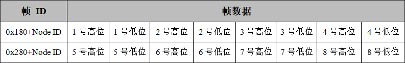 GCAN-IO-8001模塊在發(fā)出TPDO數(shù)據(jù)時,幀ID為0x180+節(jié)點號(Node ID),數(shù)據(jù)長度為8。如未接入PT100,則對應(yīng)通道的CAN數(shù)據(jù)會顯示為FF 7F。