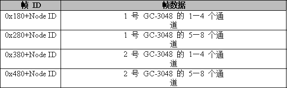 若GCAN-IO-8001同時搭載多組GC-3048模塊,那么我們以它們距離GCAN-IO-8001的遠(yuǎn)近,從近到遠(yuǎn)進(jìn)行編號,離得最近的為1號。GCAN-IO-8001耦合器發(fā)出的TPDO數(shù)據(jù)將按照下表進(jìn)行發(fā)送。例如,當(dāng)GCAN-IO-8001節(jié)點號為3且同時搭載2個GC-3048模塊時,您將收到幀ID為0x183等四組數(shù)據(jù)。其中,幀ID為0x183的八個數(shù)據(jù)字節(jié)依次對應(yīng)1號GC-3048模塊的1—4個通道;幀ID為0x283的八個數(shù)據(jù)字節(jié)依次對應(yīng)1號GC-3048模塊的5—8個通道。幀ID為0x383的八個數(shù)據(jù)字節(jié)依次對應(yīng)2號GC-3048模塊的1—4個通道;幀ID為0x483的八個數(shù)據(jù)字節(jié)依次對應(yīng)2號GC-3048模塊的5—8個通道。