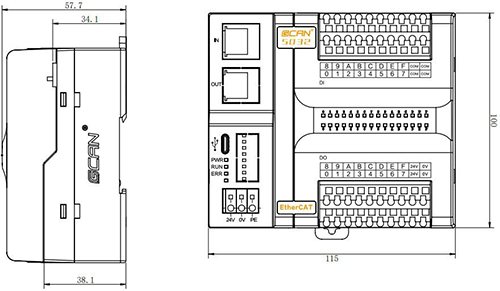 GCAN-5032外觀如圖所示,(長(zhǎng))115mm*(寬)100mm*(高)58mm。設(shè)備包含2個(gè)EtherCAT通信接口,一個(gè)USB-Type C接口,1個(gè)電源接口,2組I/O電源接口(電源內(nèi)部已短接),4個(gè)DI的COM接口。USB接口可用來(lái)升級(jí)固件。