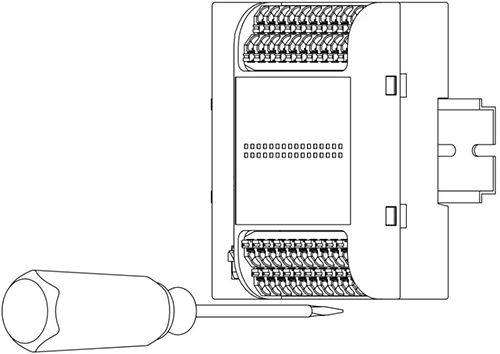 先將模塊下方的導(dǎo)軌卡扣用一字螺絲刀拉出;然后將模塊掛到DIN35導(dǎo)軌上,并使用一字螺絲刀將下方的導(dǎo)軌卡扣推進(jìn)去鎖定,如圖所示: