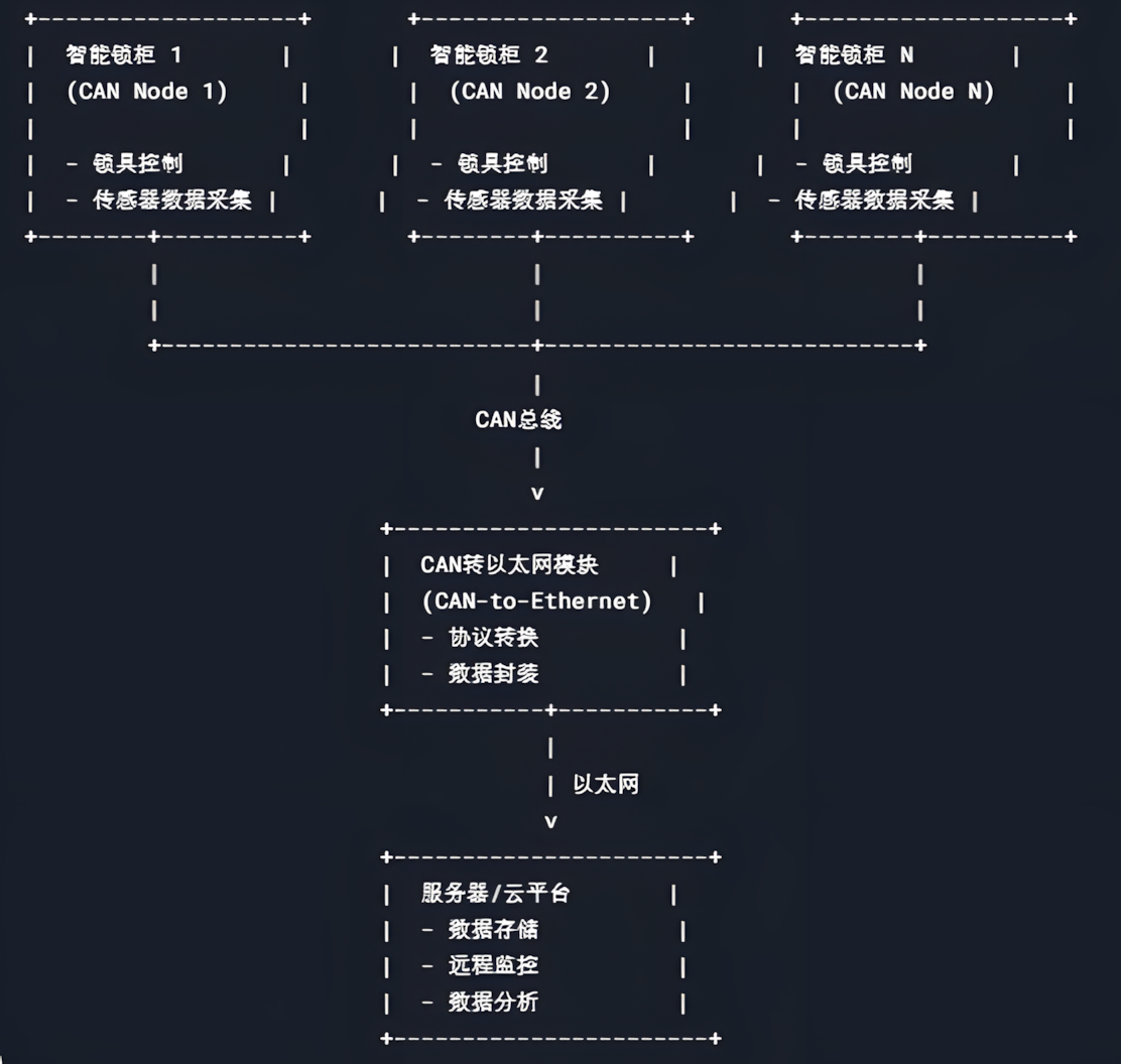 智能鎖柜節(jié)點(diǎn)通過CAN總線將數(shù)據(jù)發(fā)送至CAN轉(zhuǎn)以太網(wǎng)模塊。
