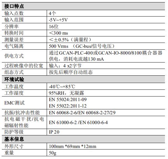 - GC-3604 模塊是集成 4 路-5V~+5V 模擬量輸入通道的 I/O 模塊。該模塊可用于實(shí)時(shí)采集模擬量信號(hào),并將采集到的數(shù)值通過內(nèi)部總線發(fā)送給 GCAN-PLC-400或 GCAN-IO-8000/8100 系列耦合器