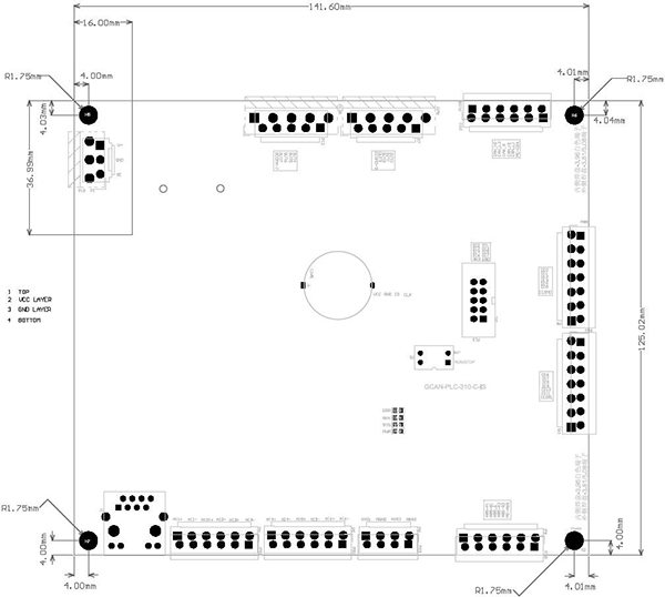 GCAN-PLC-310控制器外觀如圖2.1所示:(長)141.60mm*(寬)125.02mm。IO接口包含12路數(shù)字量輸入,8路數(shù)字量輸出,4路模擬量輸入,2路模擬量輸出;通信接口包含1路以太網(wǎng)接口,2路485接口,2路CAN接口。其中以太網(wǎng)接口,可用作以太網(wǎng)通訊及控制器編程。
