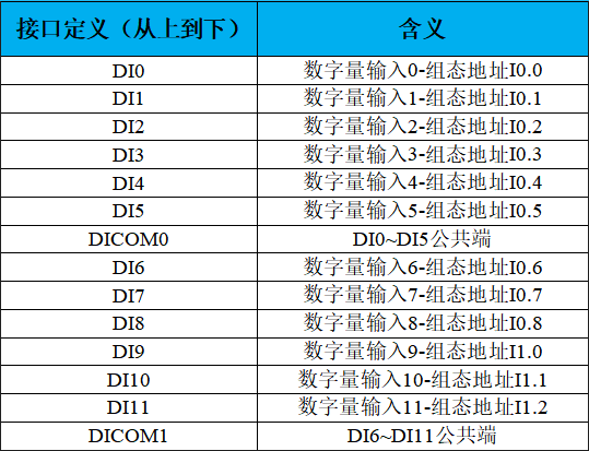 (1)12路源/漏型數(shù)字量輸入DI,輸入電壓24V DC。輸入電壓最大值為25VDC,輸入電流最大值為5mA(單通道);