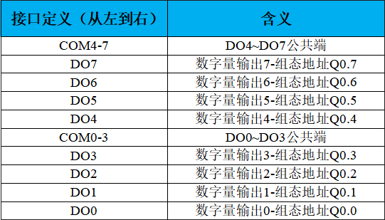 其中COM0為DO0~DO3前4路公共端;COM1為DO4~DO7后4路公共端;數(shù)字量輸出接口只能作為晶體管PNP輸出,公共端需接入DC 24V正。