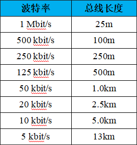 請注意:CAN-bus電纜可以使用普通雙絞線、屏蔽雙絞線。理論最大通信距離主要取決于總線波特率,最大總線長度和波特率關(guān)系詳見下表。若通訊距離超過1km,應(yīng)保證線的截面積大于Φ1.0mm2,具體規(guī)格應(yīng)根據(jù)距離而定,常規(guī)是隨距離的加長而適當(dāng)加大。