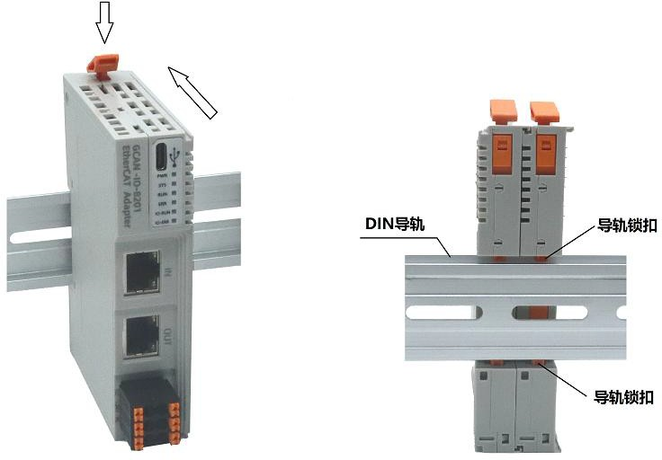 GCAN-PLC-425可編程邏輯控制器的安裝方法如下圖所示。首先把GCAN-PLC-425可編程邏輯控制器安裝在導(dǎo)軌上,再按下鎖扣并發(fā)出“咔”的一聲。