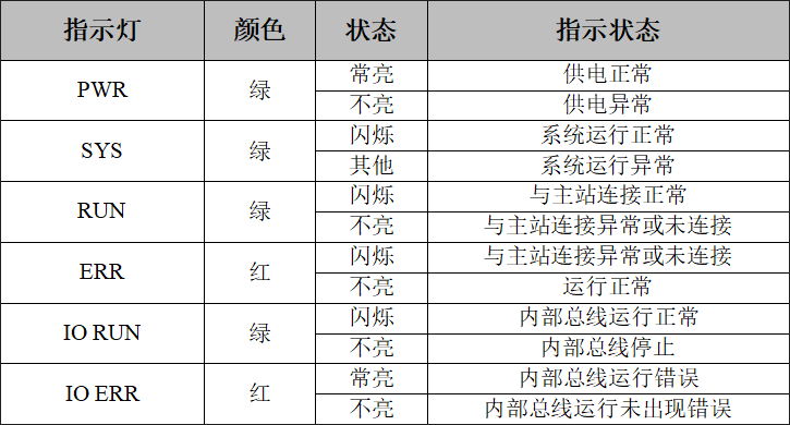 指示燈的具體指示、指示燈處于不同狀態(tài)下時(shí),GCAN-PLC-425模塊狀態(tài)如下表所示。