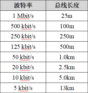 請(qǐng)注意:CAN-bus電纜可以使用普通雙絞線、屏蔽雙絞線。理論最大通信距離主要取決于總線波特率,最大總線長(zhǎng)度和波特率關(guān)系詳見(jiàn)下表。若通訊距離超過(guò)1km,應(yīng)保證線的截面積大于Φ1.0mm2,具體規(guī)格應(yīng)根據(jù)距離而定,常規(guī)是隨距離的加長(zhǎng)而適當(dāng)加大。