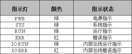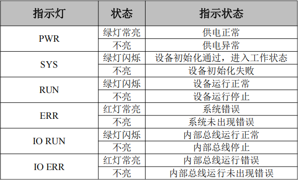 GCAN-PLC-430的正面突出區(qū)域包含6個(gè)圓形狀態(tài)指示燈。指示燈的具體指示功能見(jiàn)下表。指示燈處于不同狀態(tài)下時(shí),GCAN-PLC-430的狀態(tài)如表所示。