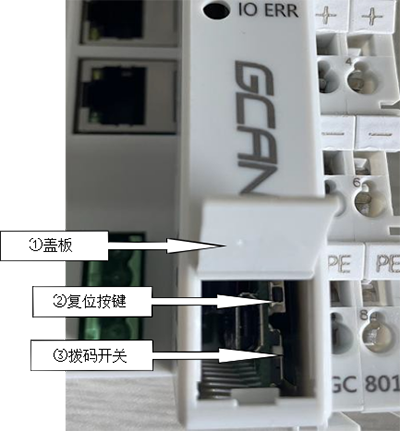 GCAN-PLC-430提供1個(gè)程序運(yùn)行開(kāi)關(guān)和1個(gè)復(fù)位按鈕。打開(kāi)蓋板后實(shí)物圖,如圖下所示: