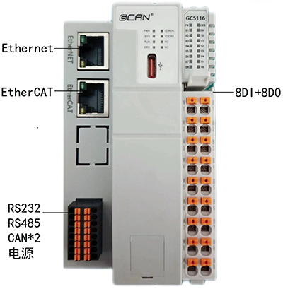完整的GCAN-PLC控制器外觀如圖所示。GCAN-PLC-535主控模塊包含總線通信接口、供電接口、自帶DIDO。其中,總線通信接口包括1個以太網(wǎng)接口、1個以太網(wǎng)/EtherCAT復用接口、1個RS232接口、1個RS485接口、2個CAN接口。編程接口使用以太網(wǎng)接口。