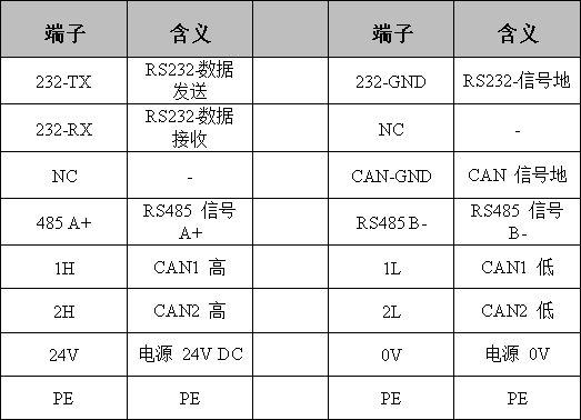 端子接口包括1個RS232、1個RS485,2個CAN總線接口和電源接口,使用插拔式雙排彈簧按壓式端子引出。