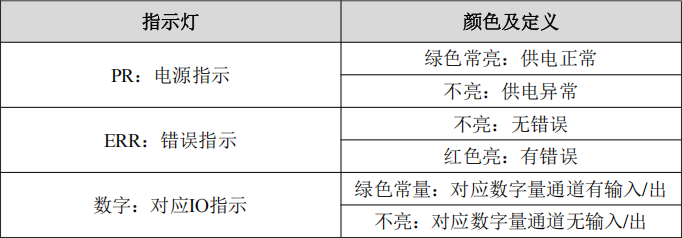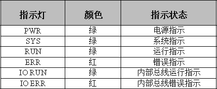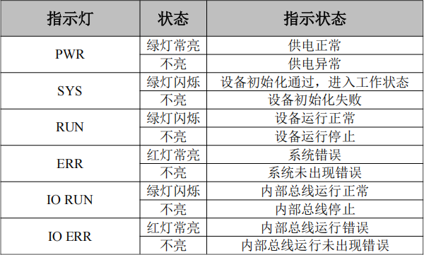 GCAN-PLC的正面區(qū)域包含6個方形狀態(tài)指示燈。指示燈的具體指示功能見下表。指示燈處于不同狀態(tài)下時,GCAN-PLC的狀態(tài)如表所示。