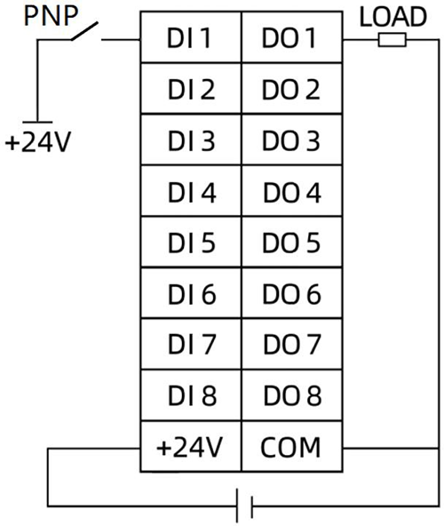 GCAN-PLC-535自帶8路輸入,8路輸出的數(shù)字量模塊GC-5116,都是PNP型,需單獨外接電源使用,額定24V DC。接線時使用一字端子接頭的線纜,將端子接頭對準相應通道的圓孔插入即可;拆線時,需使用一字螺絲刀,插入需拆線的通道對應方形孔,用力向下按壓,此時相應圓孔中的夾片會松動,線纜可輕松拔出。