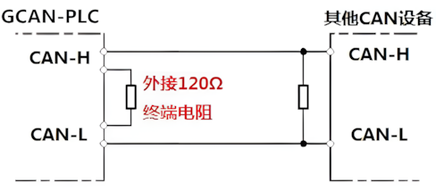 請注意:GCAN-PLC的CAN總線內(nèi)部未集成120Ω終端電阻。如果節(jié)點數(shù)目大于2,中間節(jié)點不需要安裝120Ω的終端電阻。需要使用時,將電阻兩端分別接入CAN_H、CAN_L即可,如圖所示。