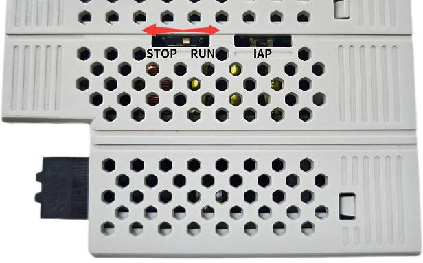 GCAN-PLC-535提供1個程序運行開關(guān)和1個復位按鈕。機身側(cè)面實物如圖所示。